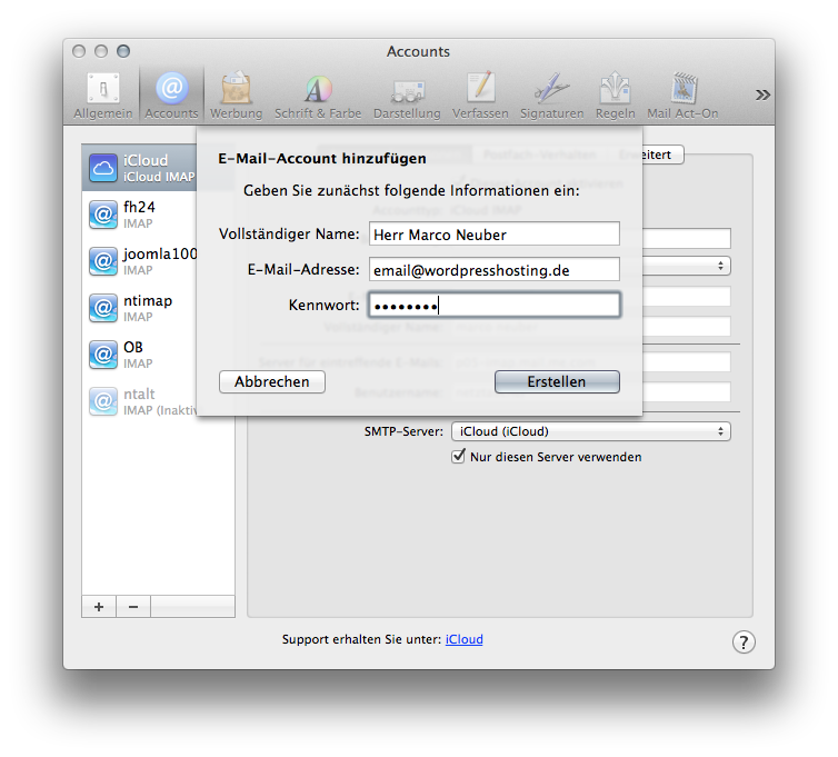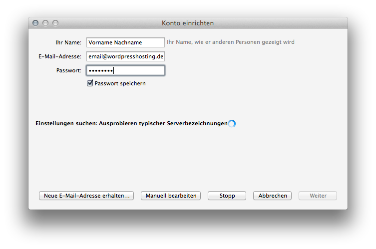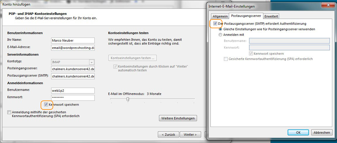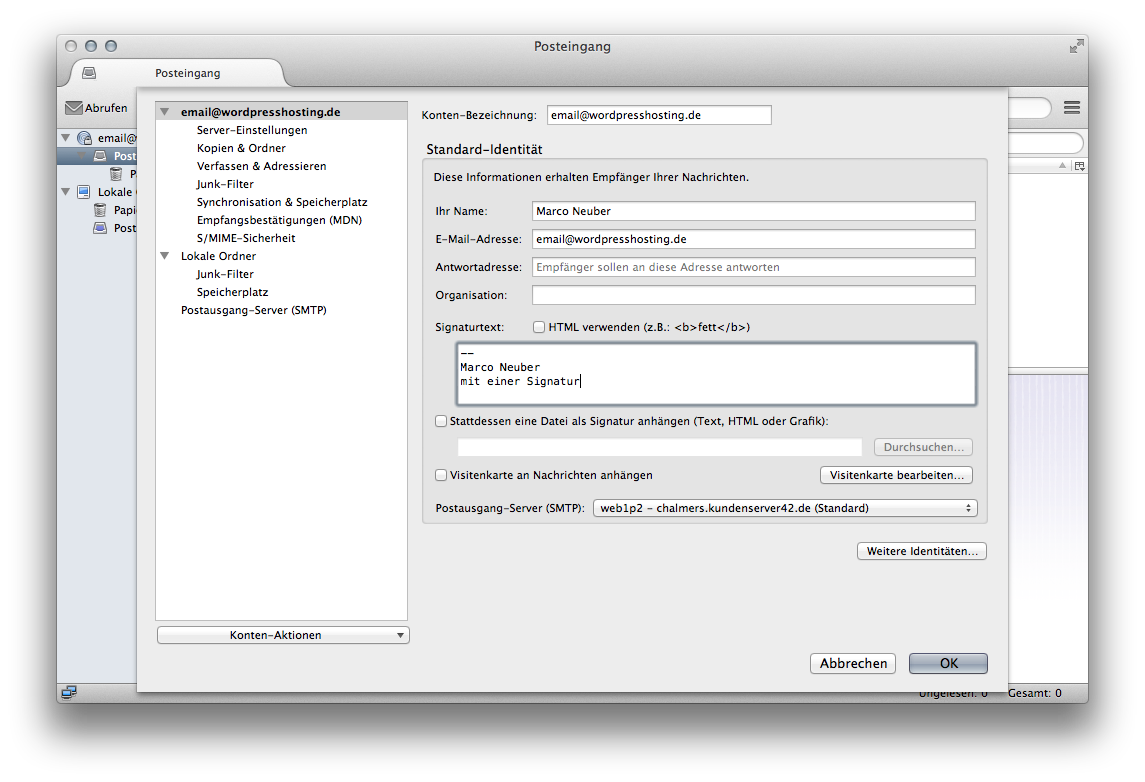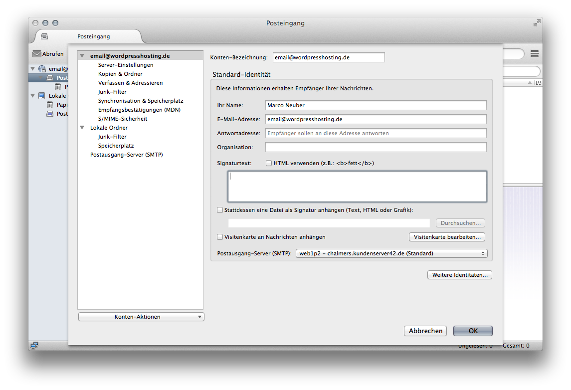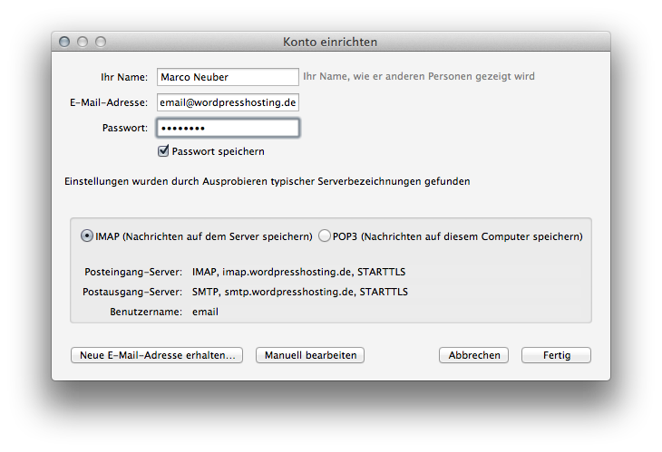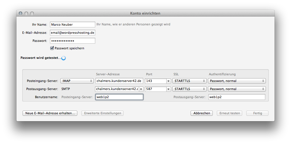 Nur wenn Sie den korrekten Servernamen eintragen, verwenden Sie SSL korrekt und es gibt keine Zertifikatsfehler im Mailprogramm. Den Namen haben Sie mit Ihren Zugangsdaten erhalten. Es ist immer ein Bewohner Springfields.