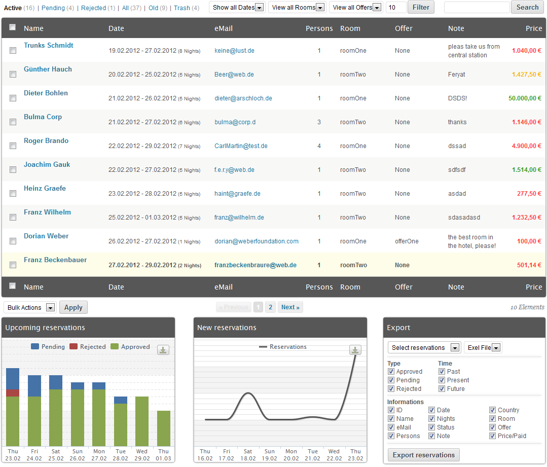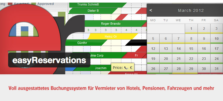 easyReservations ist eine ausgefeilte Lösung für die Buchung, die Verfügbarkeitsanzeige und Abrechnung in Hotels, Pensionen und Ferienwohnungen. Der Betreiber kann auf seiner Seite die Buchungen seiner Objekte anbieten. Eingegangene Buchungen können flexibel verwaltet.