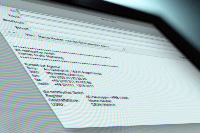 Praktisch jedes eMailprogramm bietet die Möglichkeit diese Pflichtinformationen zu hinterlegen und automatisch anzuhängen. Auch die Möglichkeiten direkt Ihre elektronische Visitenkarte anzuhängen finden Sie dort.