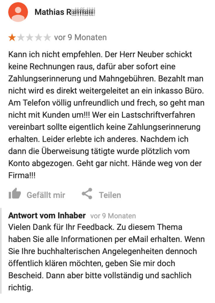 Manchmal gehen angefressene Nichtzahler dan einen Schritt weiter und veröffentlichen unwahre Bewertungen. Gerade im Fall von Rezensionen bei Google ist das besonders ärgerlich.