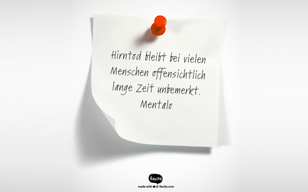 Hirntod oft unbemerkt28. Januar 2015/0 KommentareAn jedem Mittwoch poste ich Mentalos Zitat der Woche. Hier geht es zu allen Zitaten von Mentalo. Mentalo sagt Hirntod bleibt bei vielen Menschen offensichtlich lange Zeit unbemerkt. https://alt.netztaucher.com/wp-content/uploads/2015/01/hirntod.png 750 1200 Marco Neuber https://alt.netztaucher.com/wp-content/uploads/2022/09/nt-logo-2021-blau.svg Marco Neuber2015-01-28 15:21:412018-04-26 07:46:19Hirntod oft unbemerkt