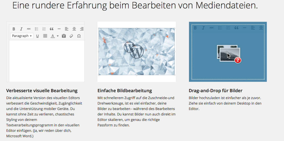 Gespannt bin ich auf die neuen Möglichkeiten in der Medienverwaltung, mit der ohne zusätzliche Plugins Grafiken, Videos und Audios per Drag & Drop eingebunden werden können.